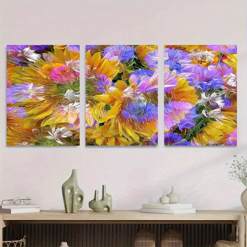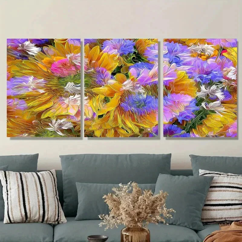 3pcs Vibrant Floral Triptych Modern Abstract Metal Print Ready to Hang Art