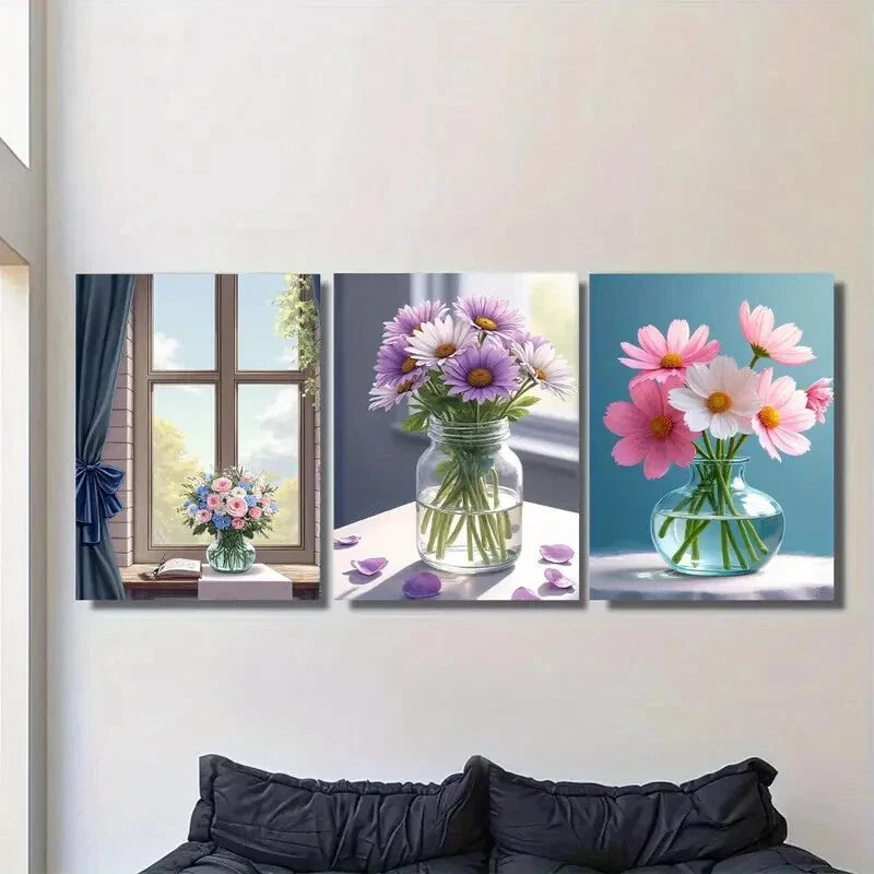 3pcs Vibrant Flowers in Vases Floral Bouquet Metal Print Ready to Hang Art