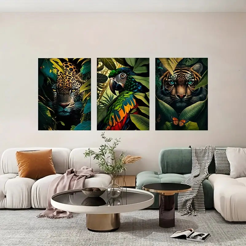 3pcs Vibrant Jungle Animal Tiger Macaw Metal Print Ready to Hang Art