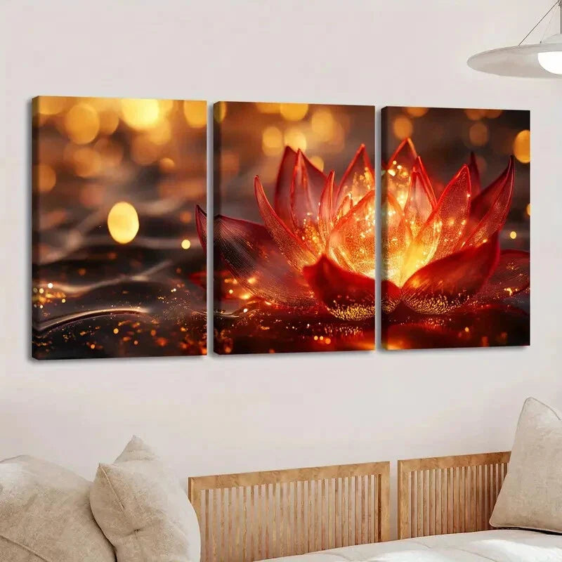 3pcs Vibrant Lotus Flower Paint Golden Hues Gold Wall Art Set Canvas Framed 40x60cm - High Quality Print 100% Australian Made Wall Canvas Ready to Hang