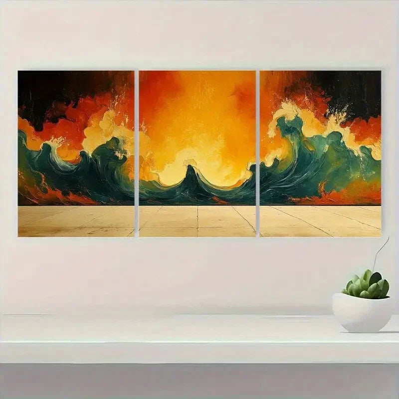 3pcs Vibrant Orange Green & Black Ocean Waves Metal Print Ready to Hang Art