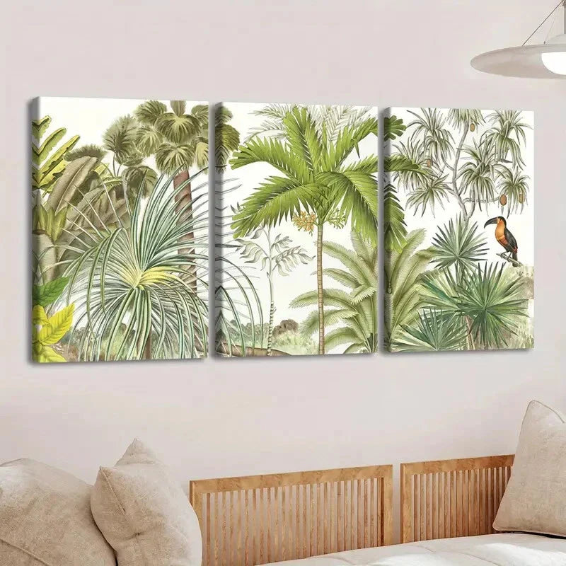 3pcs Vibrant Palm Trees Birds Green Nature White Wall Art Set Canvas Framed 40x60cm - High Quality Print 100% Australian Made Wall Canvas Ready to Hang