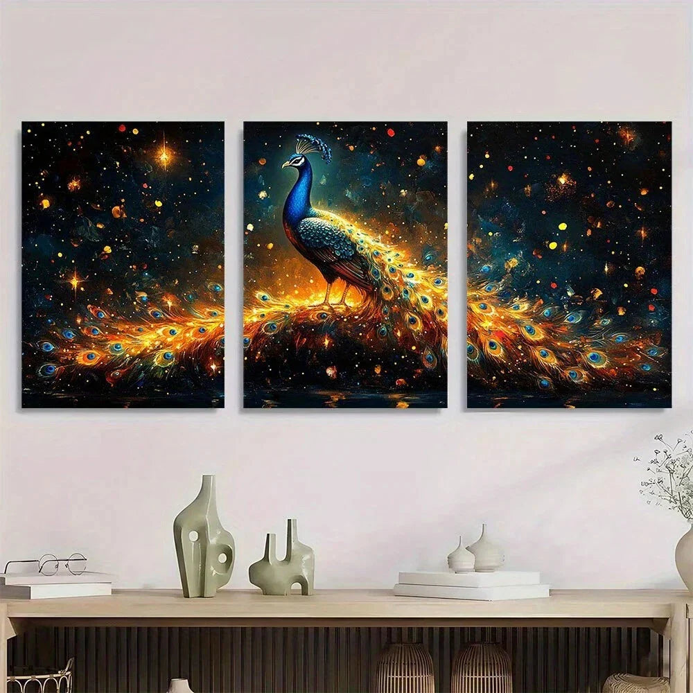 3pcs Vibrant Peacock with a Rainbow Metal Print Ready to Hang Art