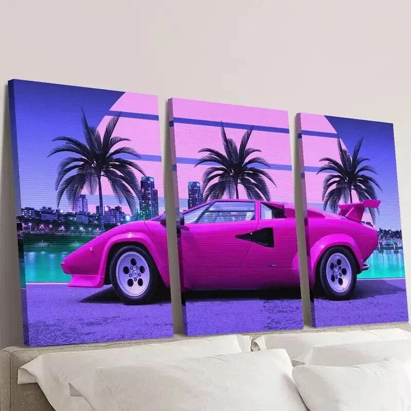 3pcs Vibrant Pink Sports Car Trees & Cityscape Wall Art Set Canvas Framed 40x60cm - High Quality Print 100% Australian Made Wall Canvas Ready to Hang