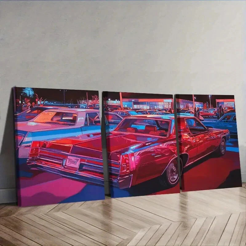 3pcs Vibrant Red & Blue Classic Cars in Night Wall Art Set Canvas Framed 40x60cm - High Quality Print 100% Australian Made Wall Canvas Ready to Hang