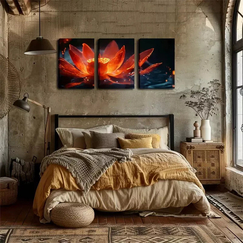 3pcs Vibrant Red Lotus Flower with Golden Accent Wall Art Set Canvas Framed 40x60cm - High Quality Print 100% Australian Made Wall Canvas Ready to Hang
