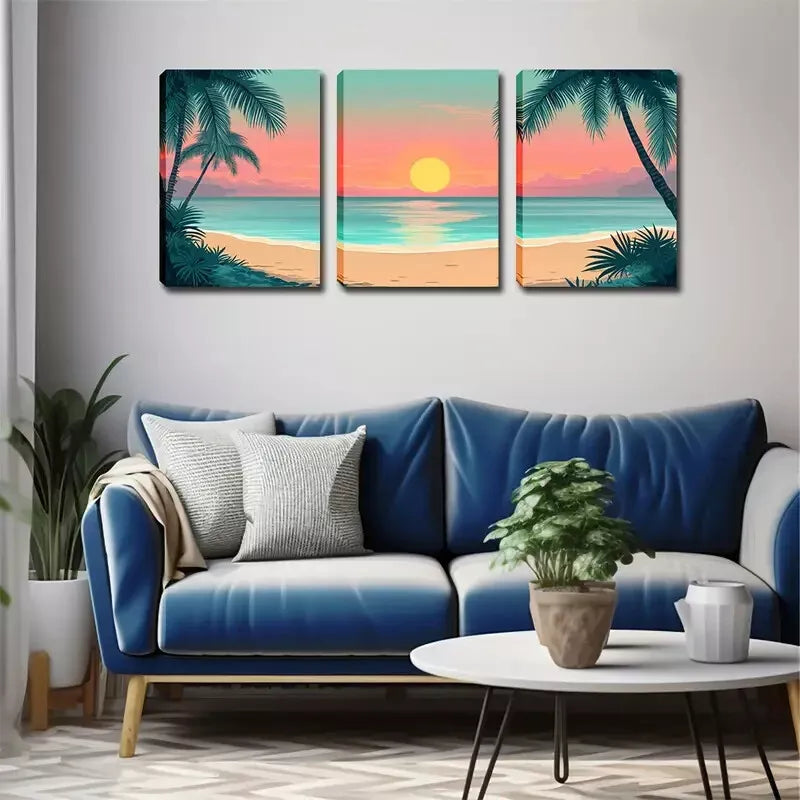 3pcs Vibrant Seaside Coconut Trees, Red Sky Wall Art Set Canvas Framed 40x60cm - High Quality Print 100% Australian Made Wall Canvas Ready to Hang