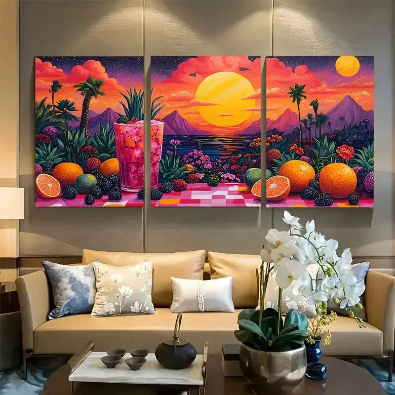 3pcs Vibrant Tropical Sunset Palm Trees Ocean Wave Metal Print Ready to Hang Art
