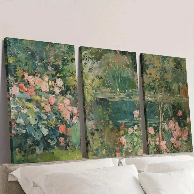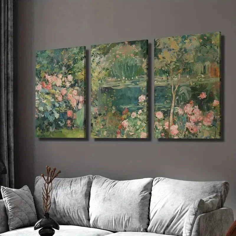 3pcs Vintage Garden Pond & Water Lilies Wall Art Set Canvas Framed 40x60cm - High Quality Print 100% Australian Made Wall Canvas Ready to Hang