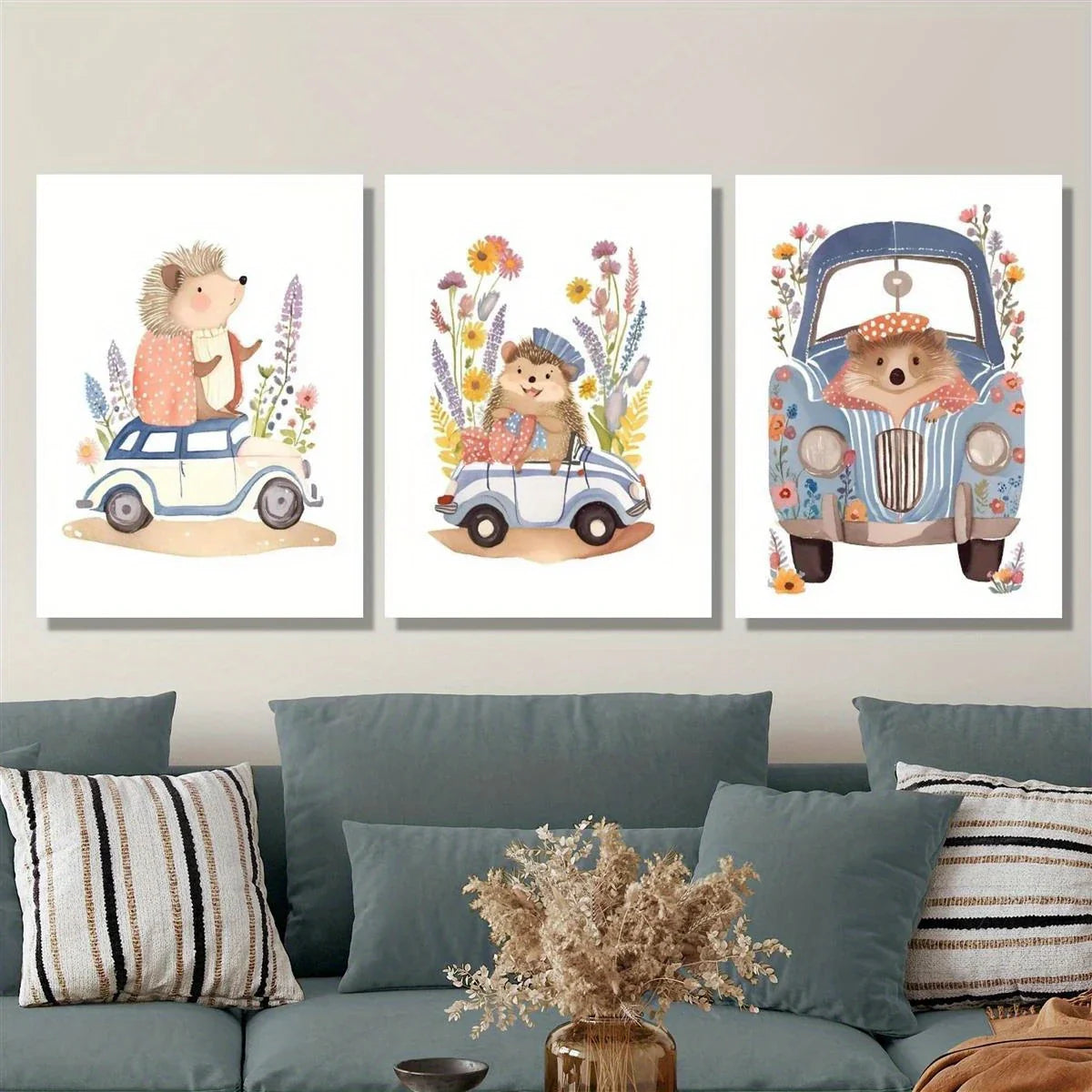 3pcs Vintage Hedgehog Animals and Flowers Classic Design Metal Print Ready to Hang Art
