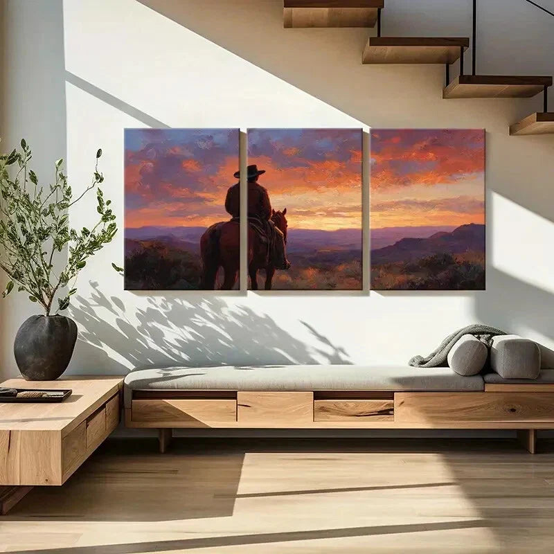 3pcs Vintage Landscape with Horseback Rider Metal Print Ready to Hang Art