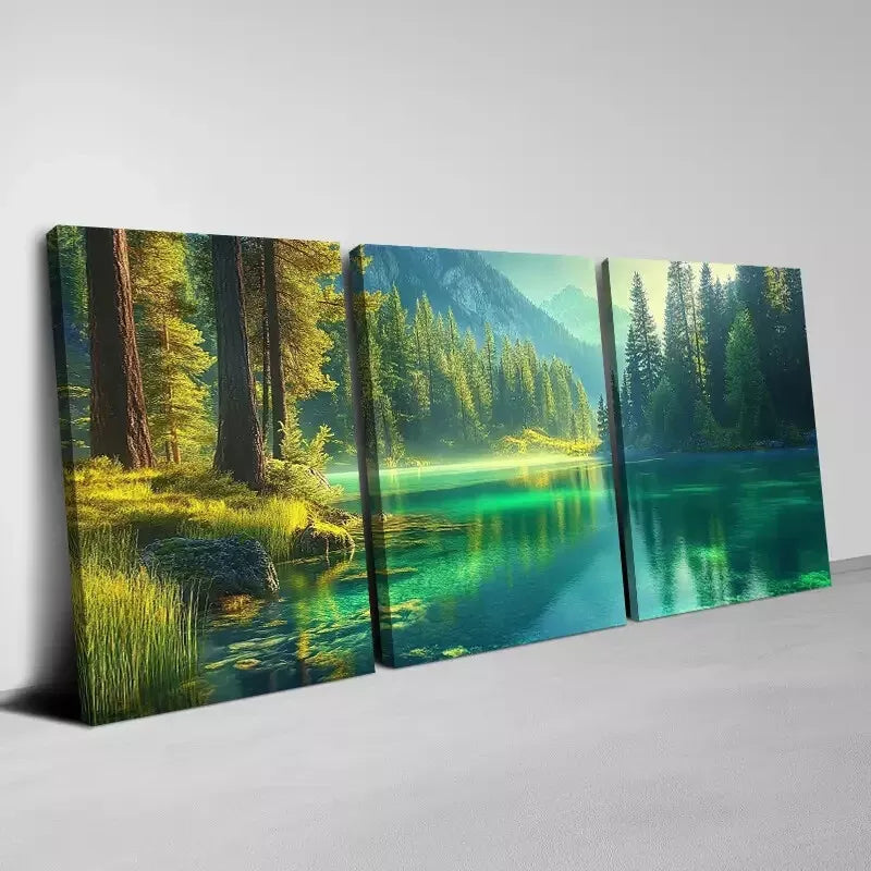3pcs Vintage Peaceful Forest Lake with Mountain Wall Art Set Canvas Framed 40x60cm - High Quality Print 100% Australian Made Wall Canvas Ready to Hang