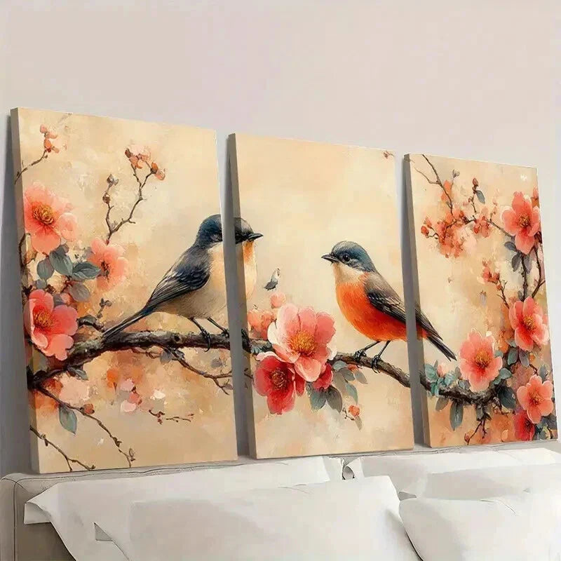 3pcs Vintage Peony Flowers And Birds Wall Art Set Canvas Framed 40x60cm - High Quality Print 100% Australian Made Wall Canvas Ready to Hang