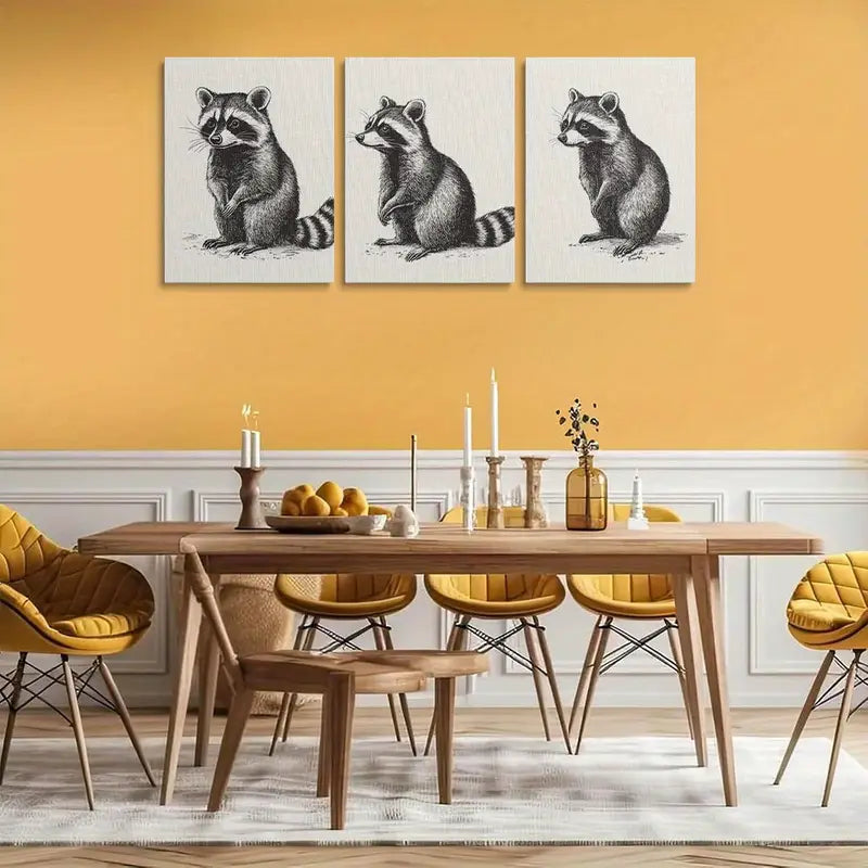 3pcs Vintage Raccoon Illustration Classic Design Metal Print Ready to Hang Art