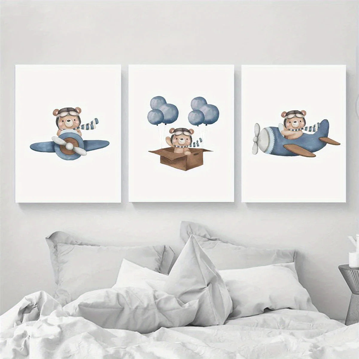 3pcs Watercolor Airplane Cute Bear Classic Design Metal Print Ready to Hang Art