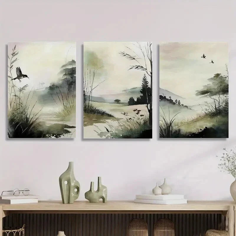 3pcs , Watercolor Birds & Pond, Ink Painting Metal Print Ready to Hang Art