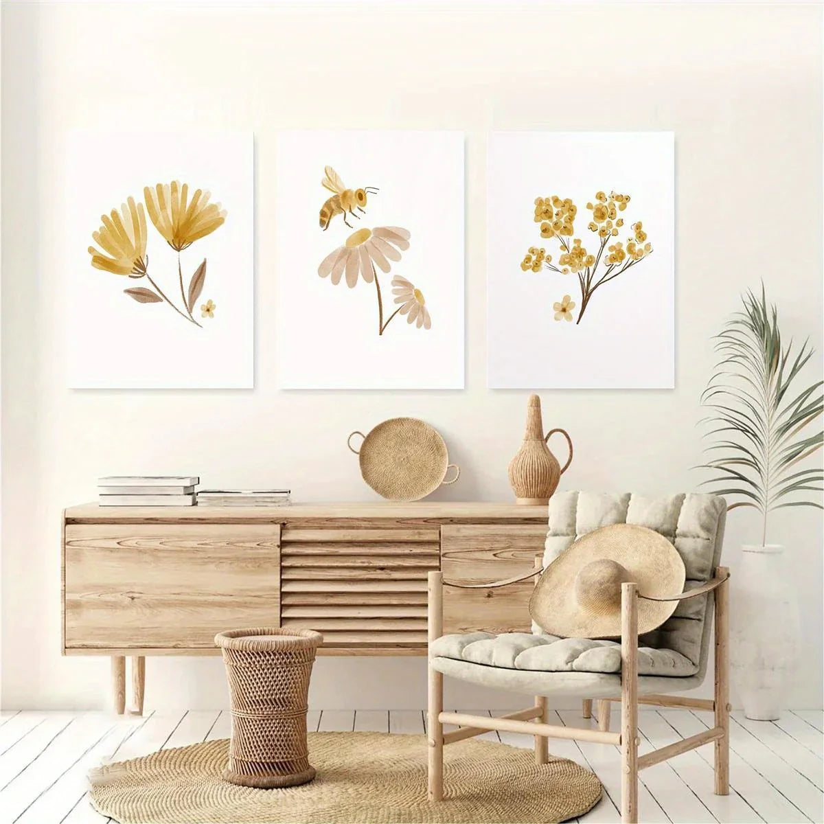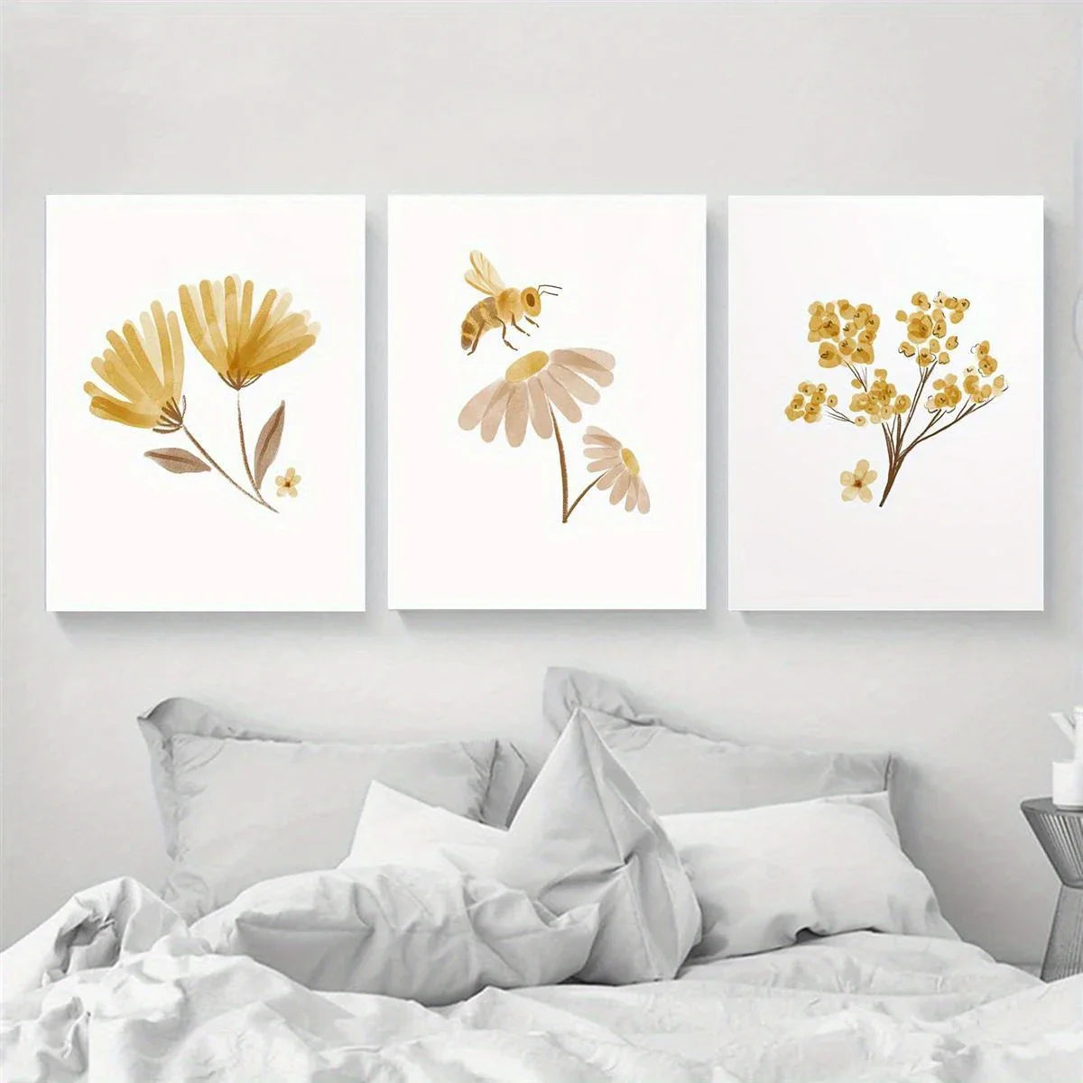 3pcs Watercolor Boho Floral Bee Golden Flowers Metal Print Ready to Hang Art