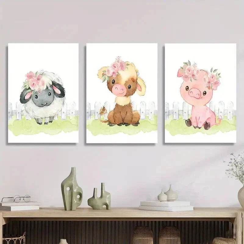 3pcs Watercolor cute calf, lamb and pig,, Metal Print Ready to Hang Art