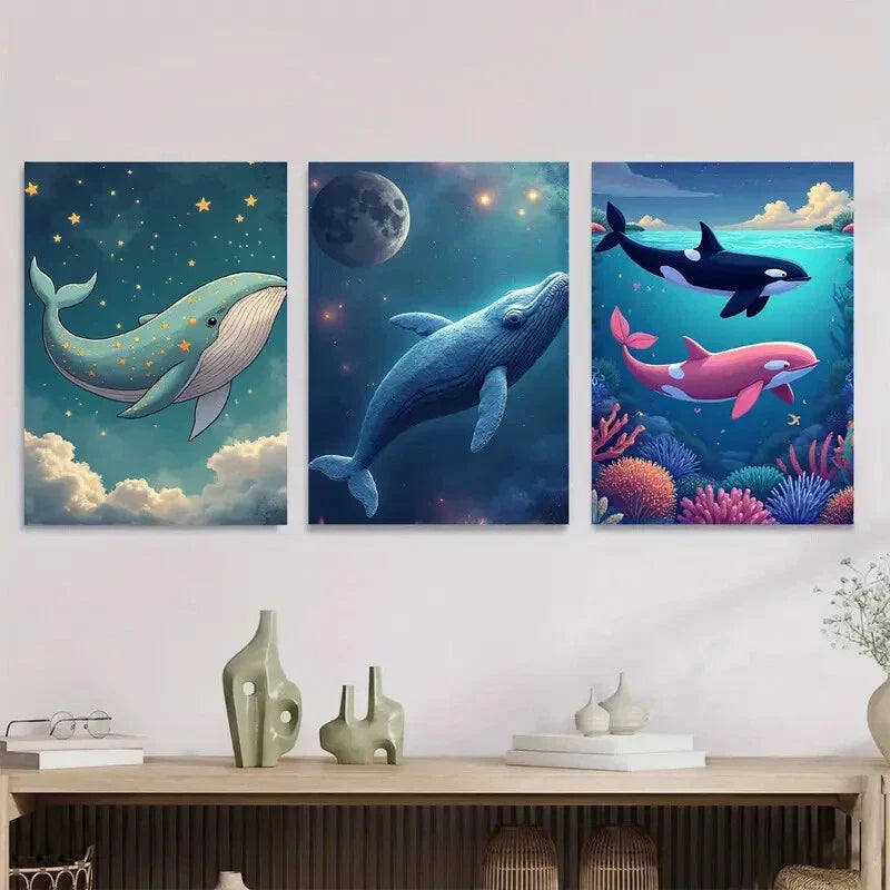 3pcs Whales and Dolphins Under The Moonlit Sky Wall Art Set Canvas Framed 40x60cm - High Quality Print 100% Australian Made Wall Canvas Ready to Hang