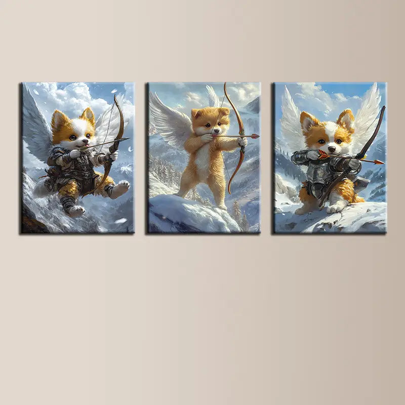 3pcs Whimsical Angel Fox with Bow and Arrow, Vibrant Metal Print Ready to Hang Art