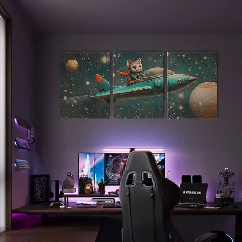 3pcs Whimsical Anthropomorphic Cat in Spaceship Metal Print Ready to Hang Art