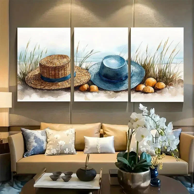 3pcs Whimsical Beach Picnic Retro Basket Straw Hat Metal Print Ready to Hang Art