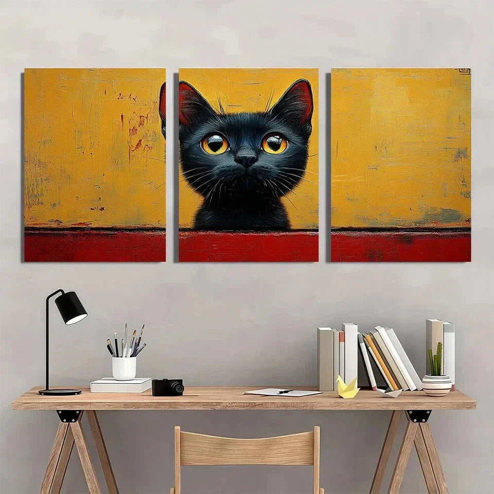 3pcs Whimsical Blue Cat Yellow Backg Metal Print Ready to Hang Art