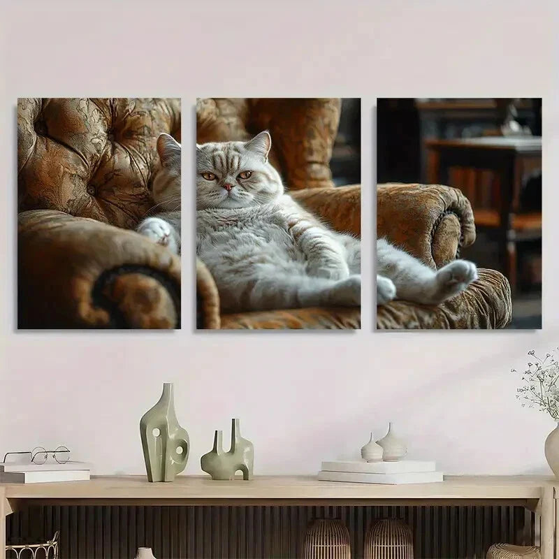 3pcs Whimsical Fat Cat on Plush Chair Metal Print Ready to Hang Art