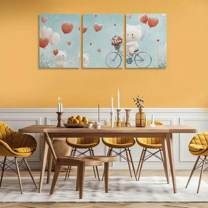 3pcs White Bear on Bicycle with Red Hearts and Balloons Metal Print Ready to Hang Art