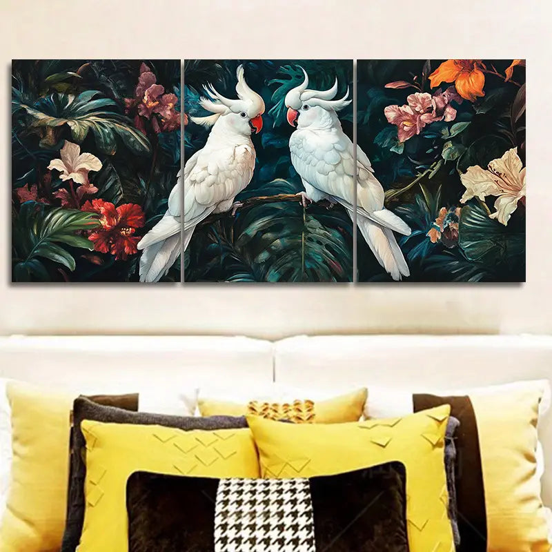 3pcs White Cockatoos & Tropical Flowers Metal Print Ready to Hang Art