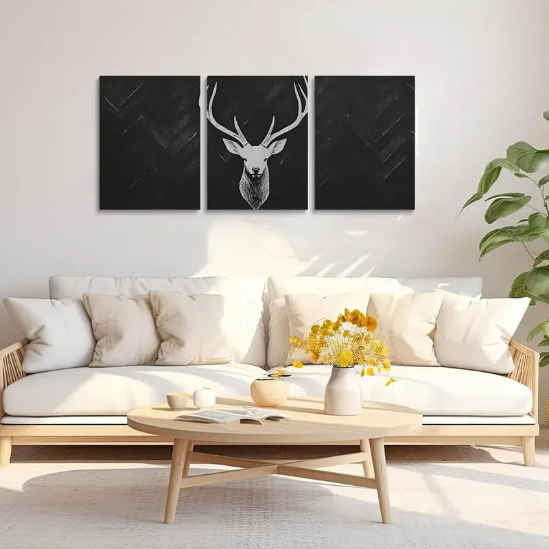 3pcs White Deer Antlers Silhouette on Herringbone Pattern Metal Print Ready to Hang Art