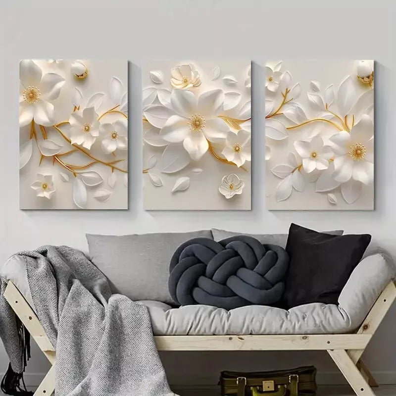 3pcs White Floral Paper Art with Golden Canvas Framed 40x60cm - High Quality Print 100% Australian Made Wall Canvas Ready to Hang