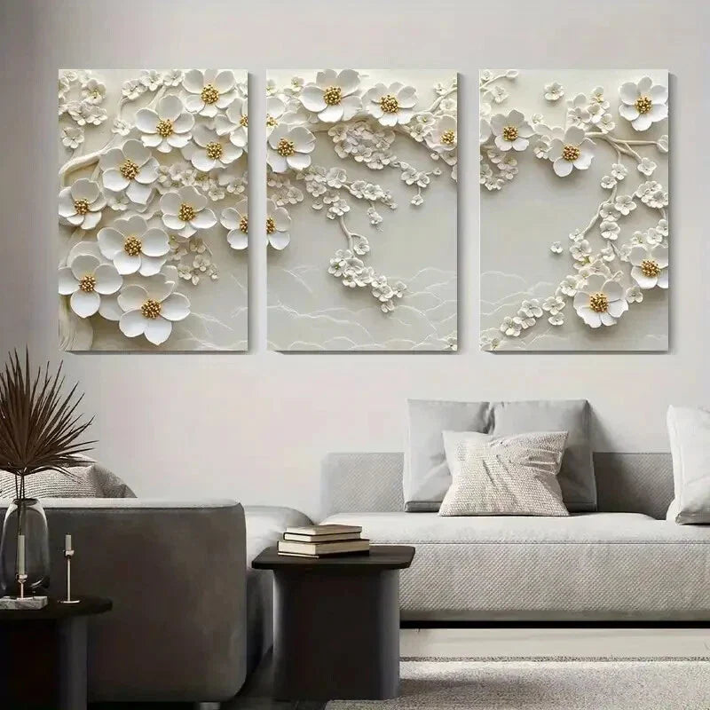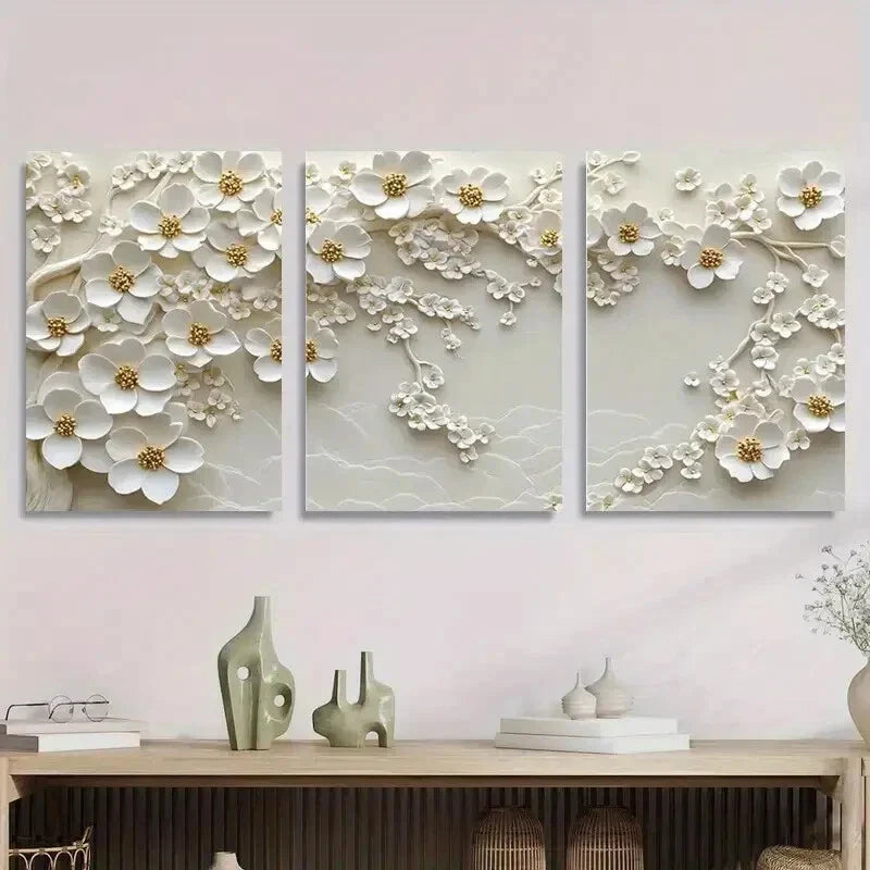 3pcs White Flower Blossom Floral Relief Metal Print Ready to Hang Art