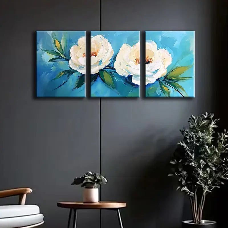 3pcs White Flowers with Blue Leaves Metal Print Ready to Hang Art