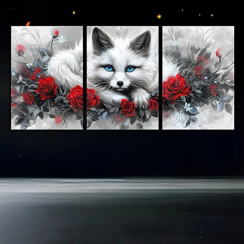 3pcs White Fox and Red Roses Stunning Blue Eyes Metal Print Ready to Hang Art
