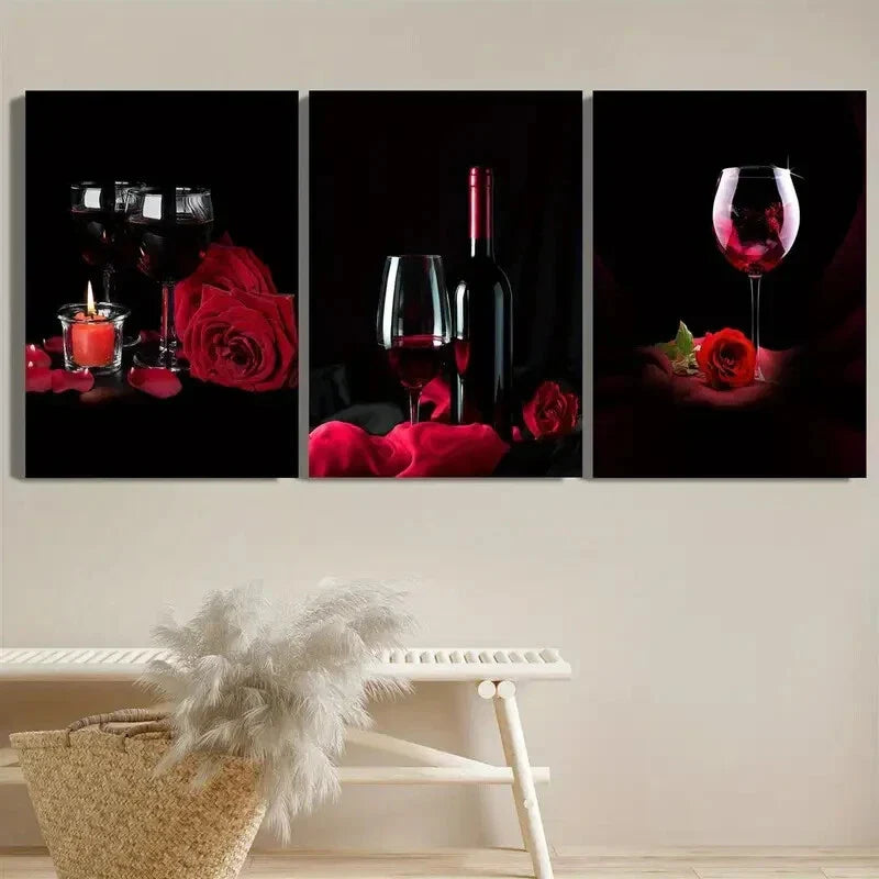 3pcs Wine Glass And Rose, Red Wine, BarMetal Print Ready to Hang Art