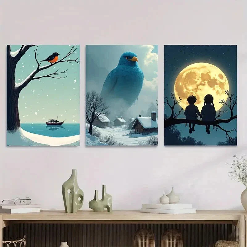 3pcs Winter Scene Blue Bird, And Moonlit Snow Wall Art Set Canvas Framed 40x60cm - High Quality Print 100% Australian Made Wall Canvas Ready to Hang
