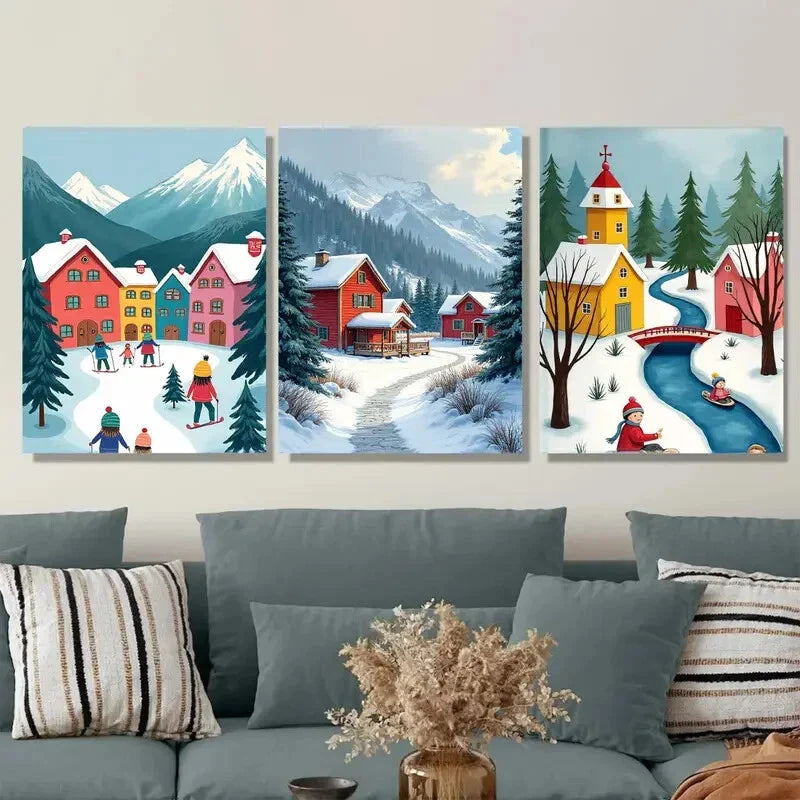 3pcs Winter Village Triptych Vibrant Snowy Metal Print Ready to Hang Art