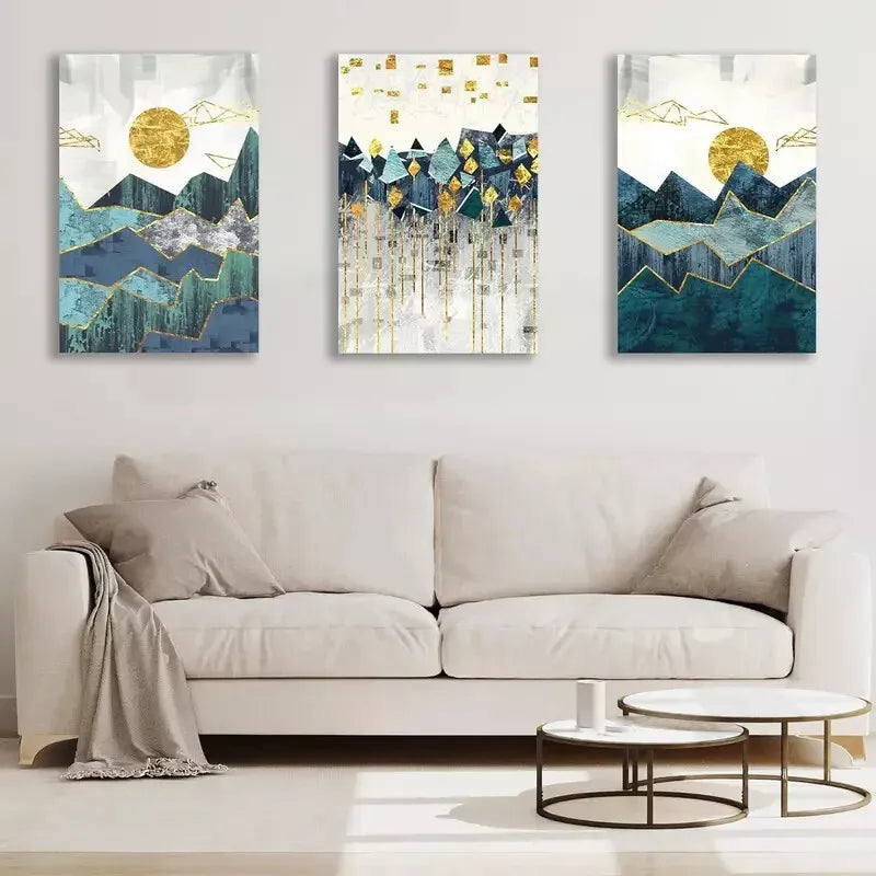 3pcs Abstract Painting Golden Sun Geometric Mountain Canvas Framed 40x60cm - High Quality Print 100% Australian Made Wall Canvas Ready to Hang