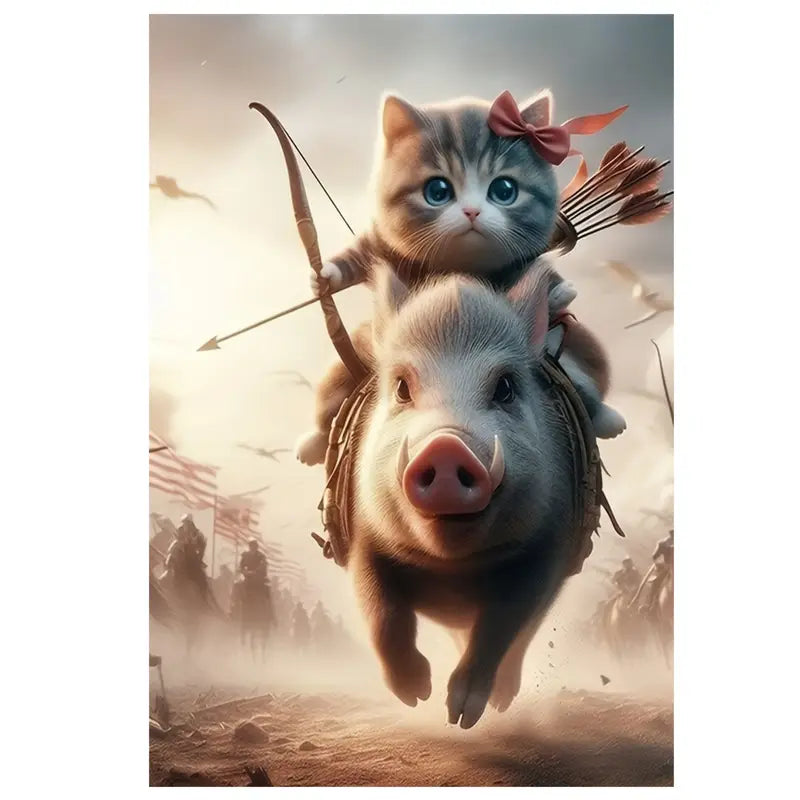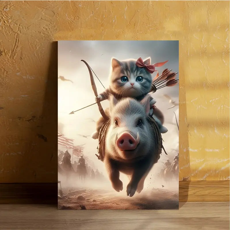 Whimsical Cat Archer & Pig Battle Scene Canvas Art Print 100% Australian Made 40x60cm Stretched Canvas Ready to Hang